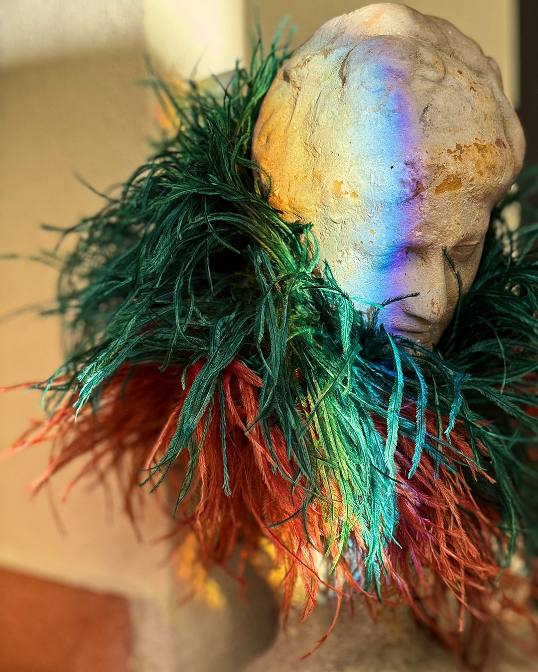 Ogni piuma, da sontuosi abiti a delicati dettagli, dai boa di struzzo utilizzati per colli, cerchietti e diademi dalle mille sfumature, racconta una storia di eleganza, sensualità e leggerezza. È un sapere artigiano costruito nel tempo, affinato decennio dopo decennio, in cui le tecniche tradizionali dialogano con nuove visioni e linguaggi contemporanei.